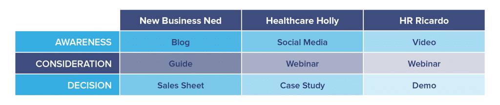You can make sure you’re providing the right content at the right time for the right persona by creating an audience persona matrix. Here’s an example: