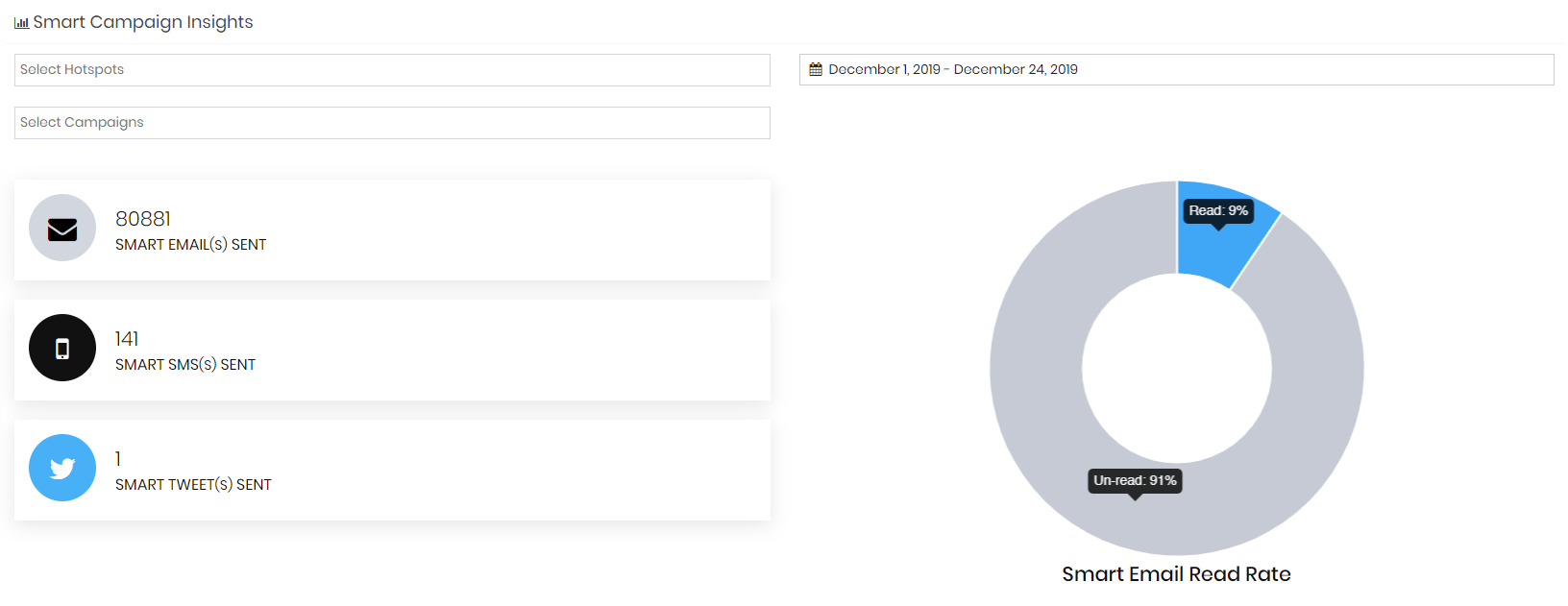 Offer Simple and Efficient insights for your WiFi marketing efforts. Track emails sent by Hotspot, Campaign, with a visual donut chart on read rates.